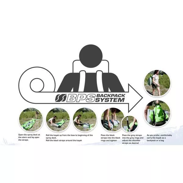 - Backpack System für einfaches Verstauen und Transportieren: Nach dem Entlüften wird das Kajak in die Spritzdecke hineingerollt. Das kompakte Paket hat Schulterriemen und kann bequem wie ein Rucksack auf dem Rücken transportiert werden.