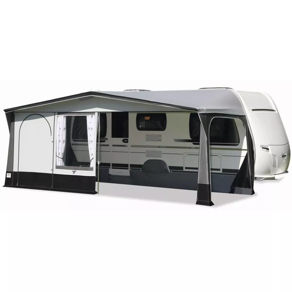 Die 4-teilige Vorderwand ermöglicht es dir, die Eingangstür individuell zu platzieren. Die Seitenwand-Elemente sind gegenseitig austauschbar. Dadurch kannst du den Seiteneingang entweder seitlich hinten am Wohnwagen oder vorne an der Vorderwand platzieren. Beide Seitenwände mit sind grossen Moskito-Fenstern versehen. So ist eine optimale Querlüftung garantiert. Die Seitenfenster können mit Fensterfolien-Klappen blickdicht geschlossen werden. Die mitgelieferten Gardinen sorgen ebenfalls für Wohnkomfort und Privatsphäre. Der 3-fach-Erdstreifen garantiert, dass Regenwasser nach Aussen abläuft und Schmutz draussen bleibt.